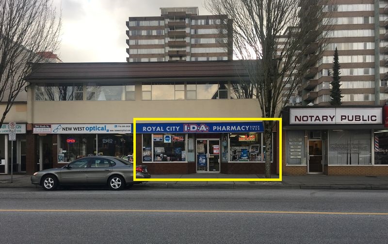 Seldom available in this neighbourhood, 2100 square feet of retail space with 30 foot strorefront and illuminated sign. Terrific location in “Uptown” New Westminster next to Rexall Drugs and a few blocks from Royal City Centre shopping mall. High density residential towers to the West and single family homes to the East provide a wide demographic customer base.